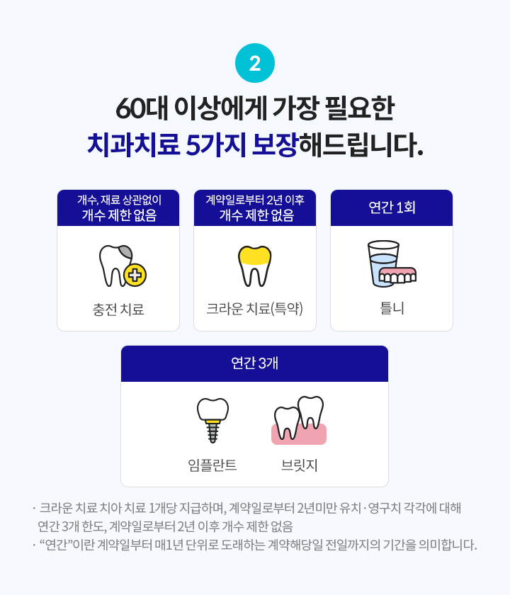 | 크라운치료보험금 | 피보험자가 보험기간 중 치아우식증(충치), 치주질환(잇몸질환) 또는 재해를 직접적인 원인으로 크라운치료보장개시일 이후에 최초로 크라운치료를 진단확정받고 해당 치아에 크라운치료를 받았을 때 (치아 치료 1개당 지급하며, 계약일부터 2년 미만 유치∙영구치 각각에 대해 연간 3개를 한도, 계약일부터 2년 이후 개수제한 없음) |