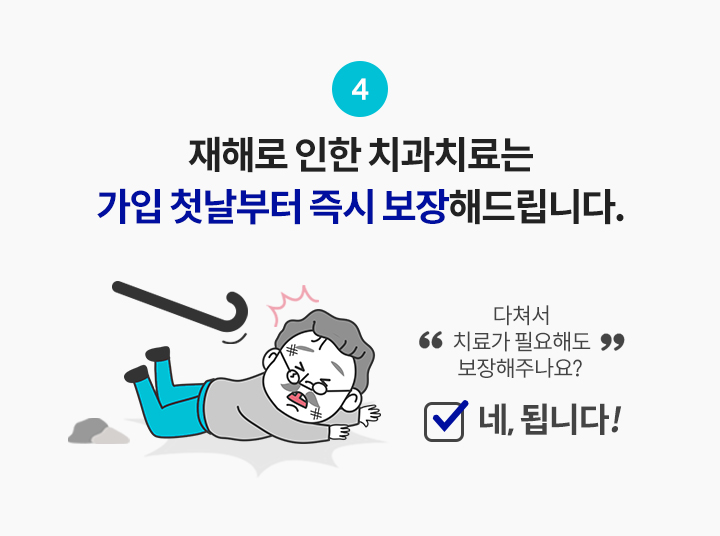 | 충전치료보험금 | 피보험자가 보험기간 중 치아우식증(충치), 치주질환(잇몸질환) 또는 재해를 직접적인 원인으로 치과치료보장개시일 이후에 최초로 충전치료를 진단확정받고 해당 치아에 충전치료를 받았을 때 (치아 치료 1개당 지급함) |